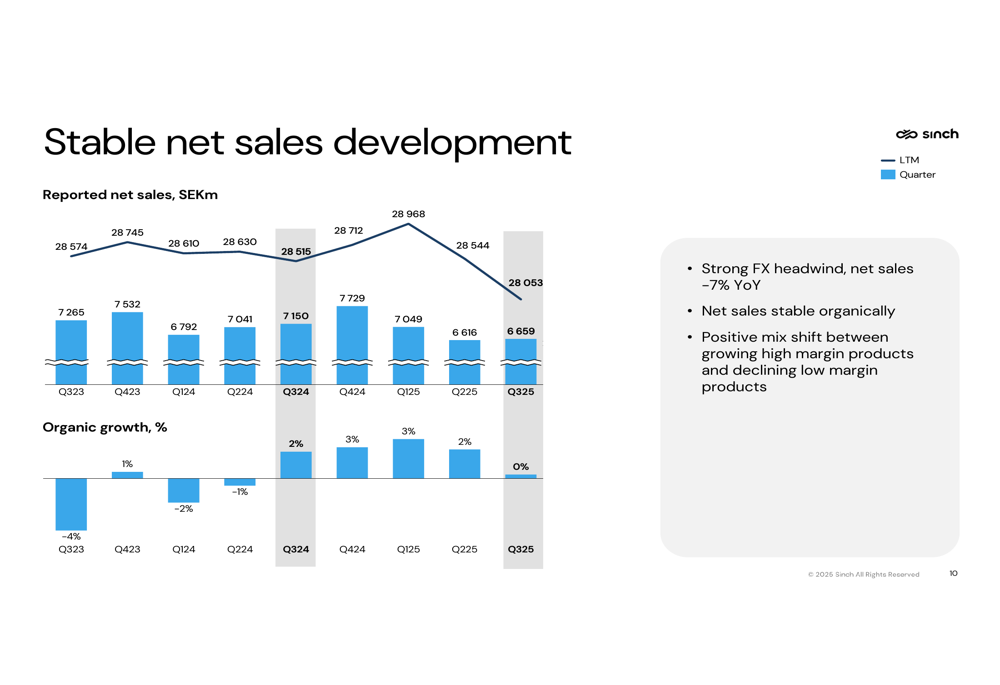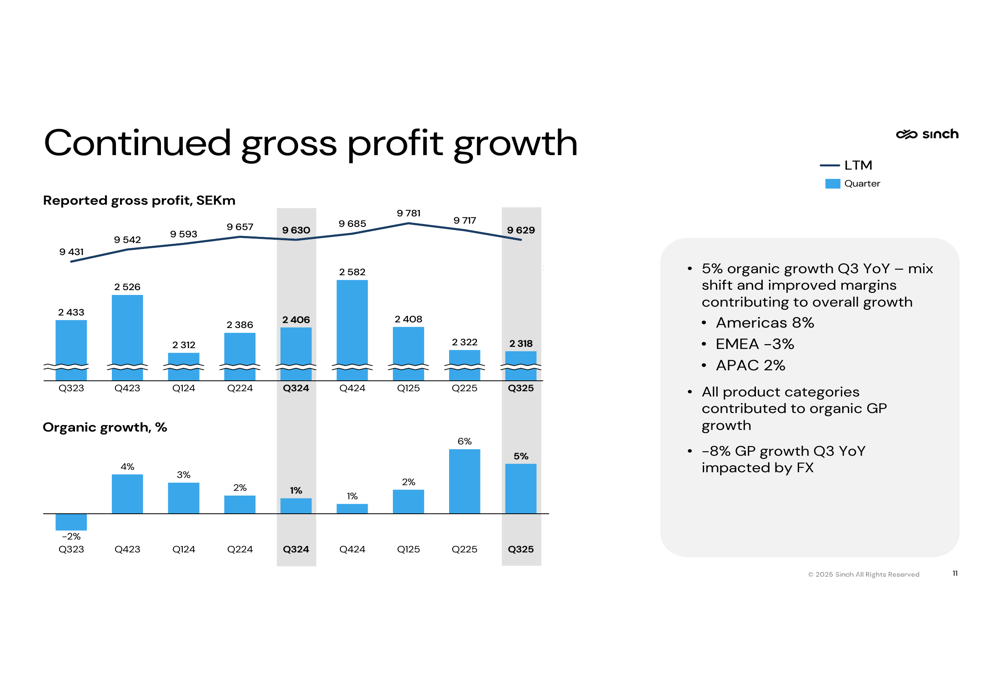 Sinch reported stable organic gross profit growth of 5% year-over-year, consistent with the previous quarter's performance. However, net sales amounted to SEK 6,659 million, with currency effects having a significant negative impact of 7%.