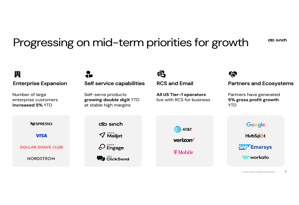 Sinch highlighted progress in its mid-term priorities for growth, noting that the number of large enterprise customers increased 5% year-to-date, while self-serve products are growing at double-digit rates with stable high margins.