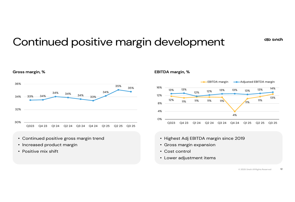 A key bright spot in Sinch's results was margin improvement, with gross margin increasing to 35%, up 1 percentage point year-over-year, while adjusted EBITDA increased 8% organically to reach a record high margin of 14% since 2019.