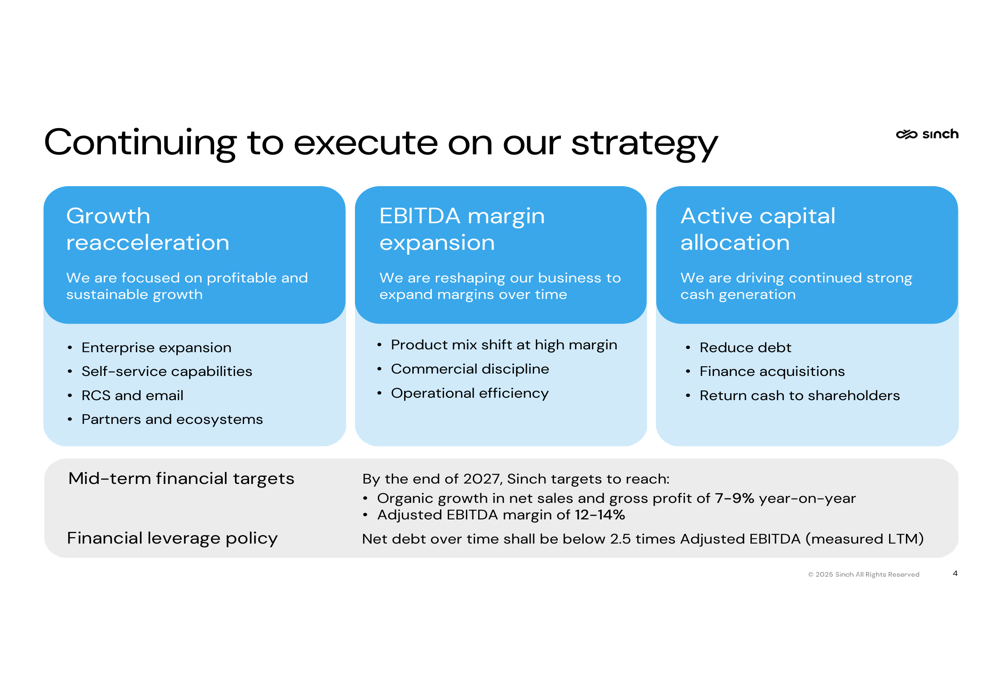 Sinch's presentation emphasized its strategic focus on three key areas: growth reacceleration, EBITDA margin expansion, and active capital allocation. The company is prioritizing profitable and sustainable growth through enterprise expansion, self-service capabilities, RCS and email, and partners and ecosystems.