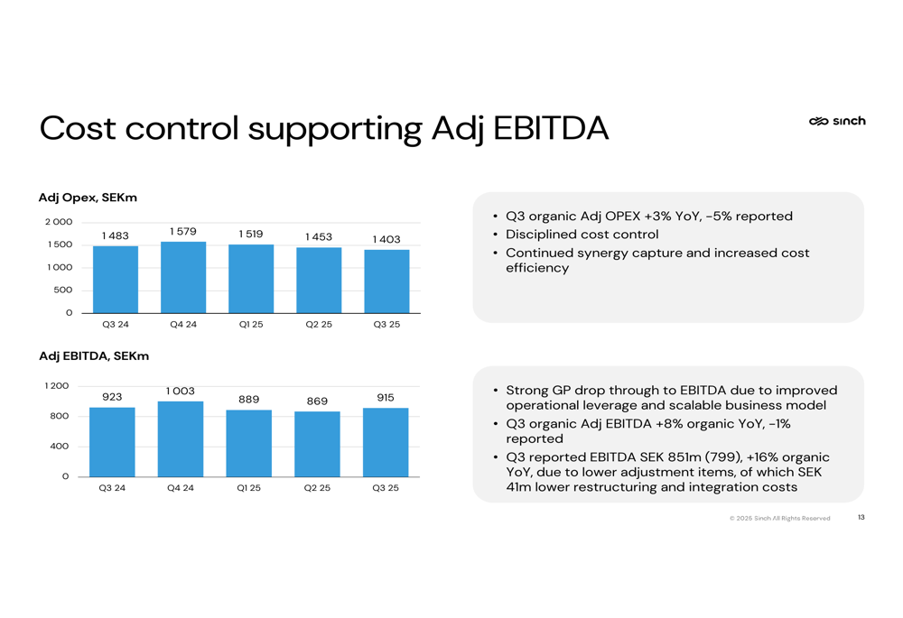 Sinch's balance sheet remains relatively strong, with net debt/Adjusted EBITDA increasing slightly to 1.4x, primarily due to share repurchases. The company has repurchased 15.3 million shares for SEK 519 million, representing 1.8% of outstanding shares, while also allocating SEK 241 million for LTIP equity swap.