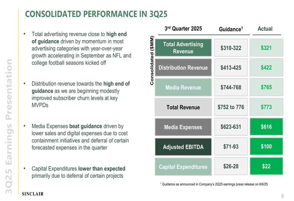 A more detailed breakdown of Sinclair's consolidated performance shows that total advertising revenue reached $321 million, near the high end of guidance due to momentum across most advertising categories. Distribution revenue also performed well at $422 million, while media expenses came in below guidance at $616 million, driven by lower sales and digital expenses.