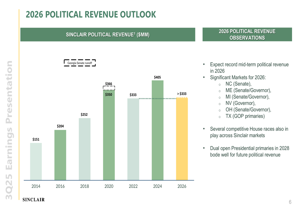 Looking ahead to 2026, Sinclair expects record mid-term political revenue, with significant markets including North Carolina, Maine, Michigan, Nevada, Ohio, and Texas driving political advertising spend. The company's historical political revenue shows a consistent upward trend, with projections for 2026 exceeding $333 million.