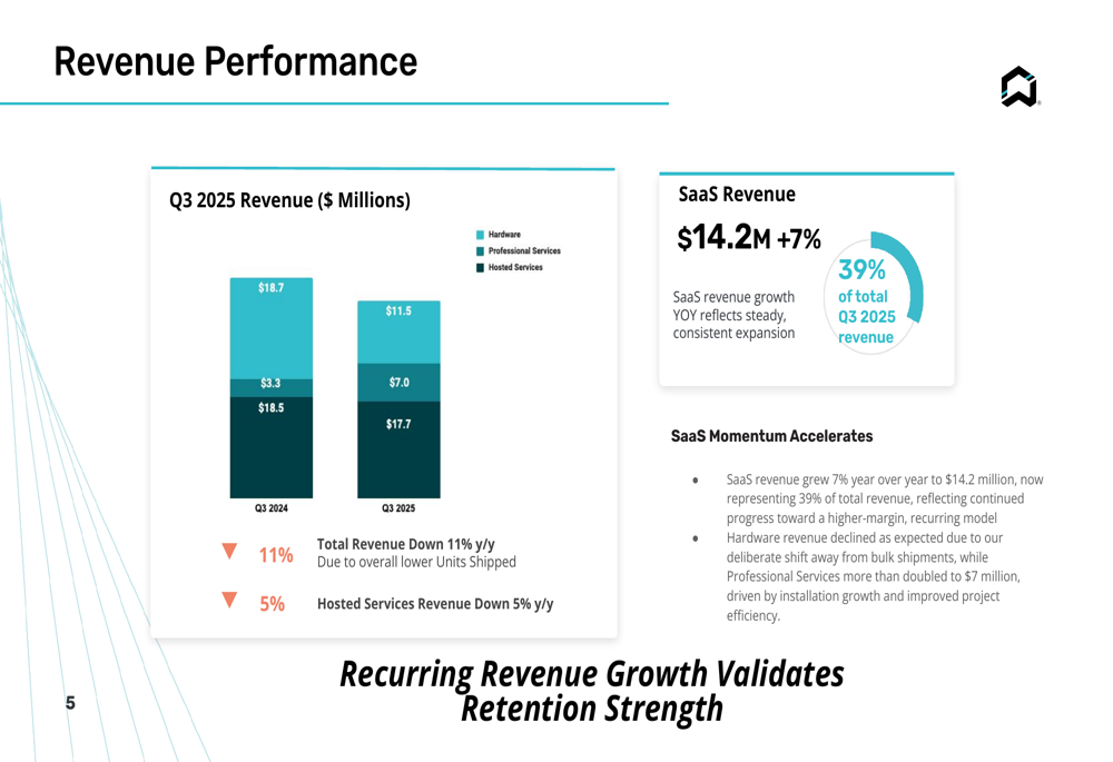 The revenue breakdown shows the company’s transition in progress, with hardware revenue declining while SaaS revenue continues to grow: