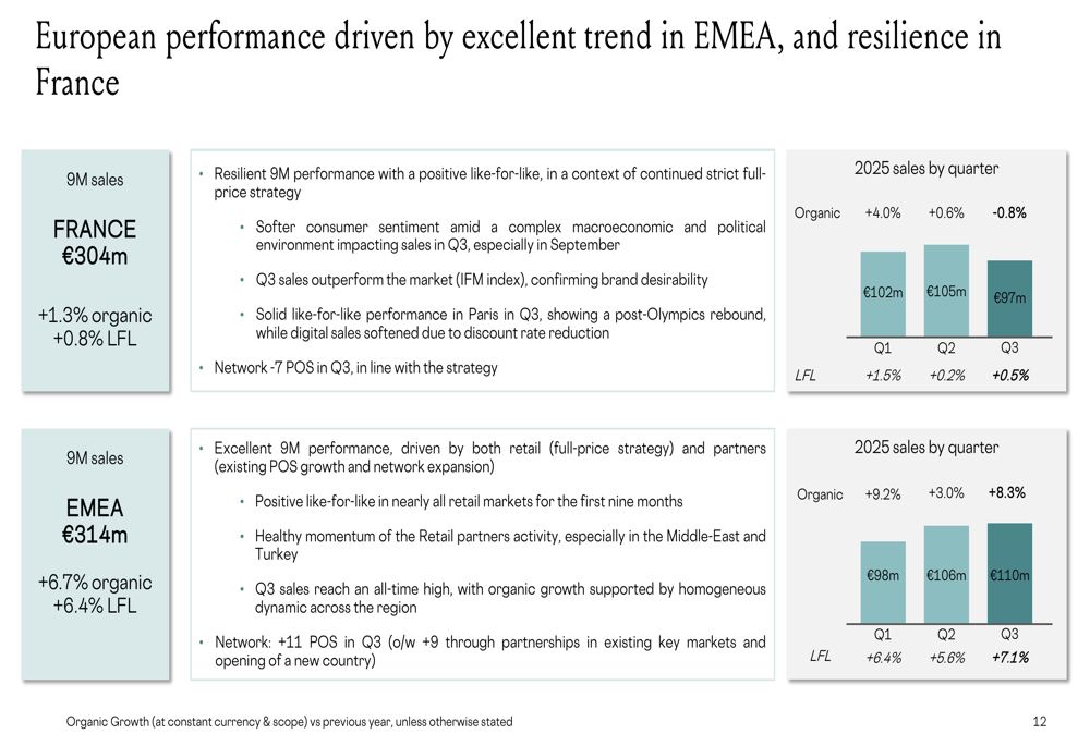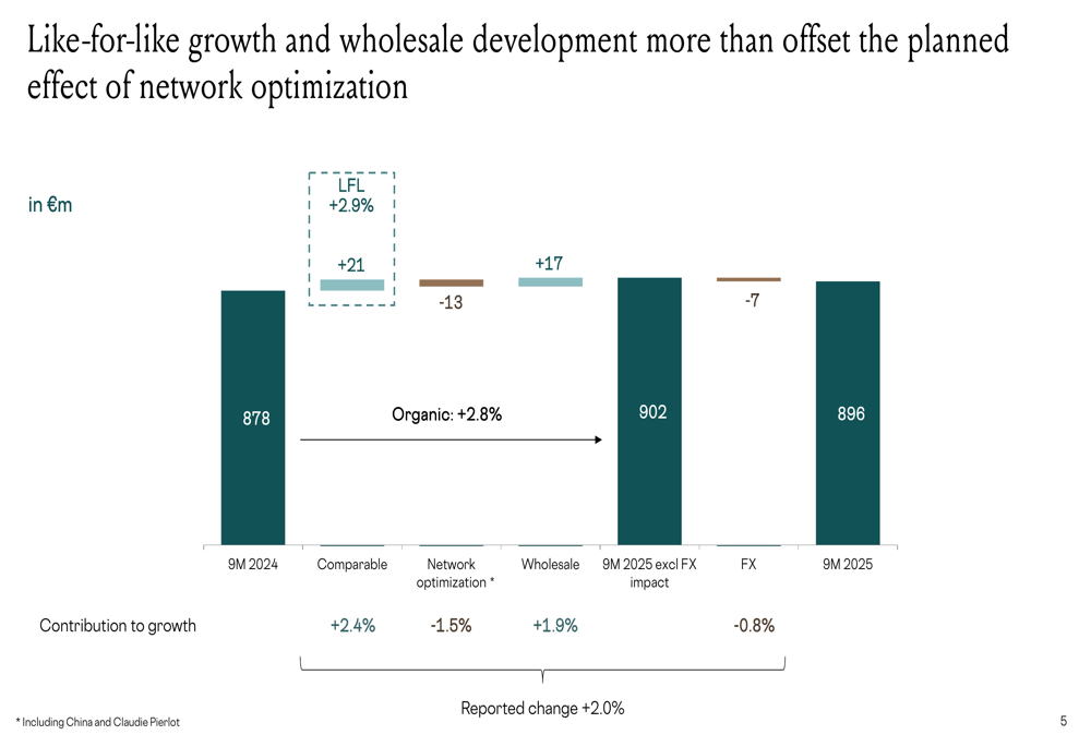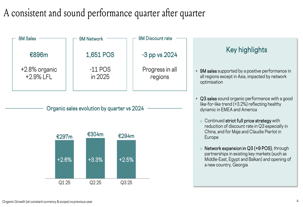 SMCP maintained consistent quarterly organic growth throughout 2025, with Q1 at +2.6%, Q2 at +3.3%, and Q3 at +2.5%. The third quarter showed particularly strong like-for-like sales growth of 3.2%, demonstrating healthy consumer demand for the company’s brands.