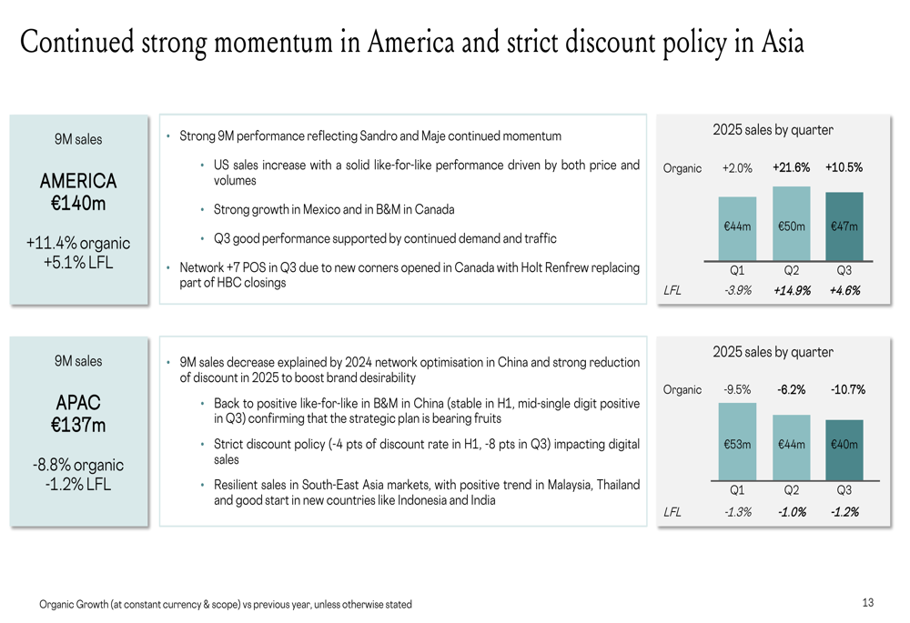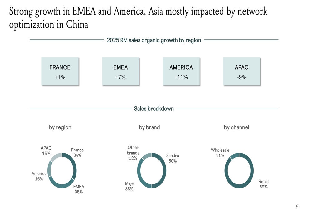 Europe remained SMCP’s largest market, with France accounting for 34% of sales and EMEA (excluding France) representing 35%. The Americas contributed 16% to total sales, while APAC accounted for 15%.