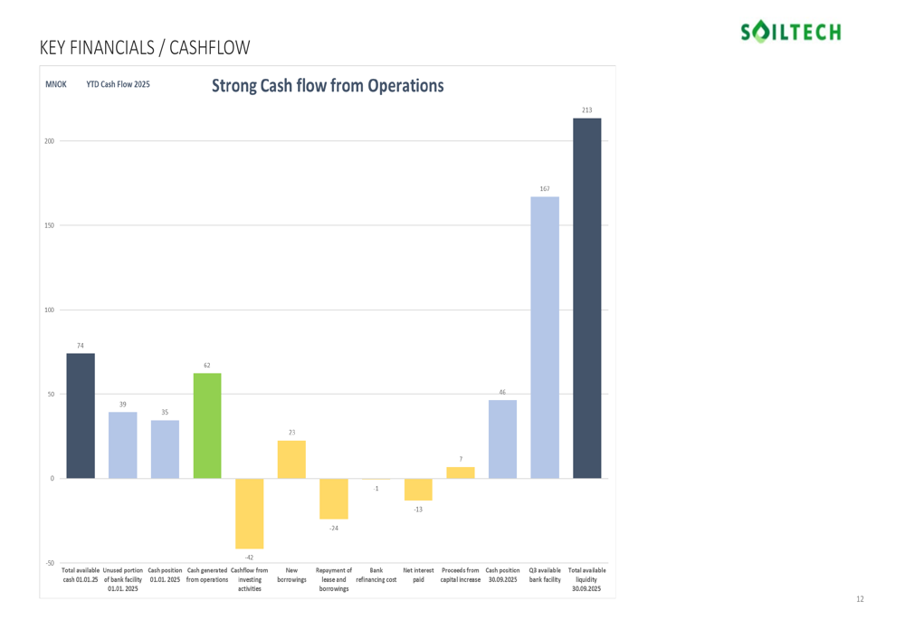 Soiltech maintains a strong liquidity position, with a cash balance of NOK 46 million as of September 30, 2025, and a total available liquidity of NOK 213 million including unused bank facilities. The company generated NOK 62 million in cash from operations year-to-date, demonstrating solid operational cash conversion.