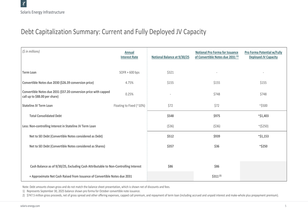 If convertible notes are treated as debt, SEI's pro forma net debt would be approximately $1,153 million at full deployment. However, if considered as equity, this figure drops dramatically to around $250 million, highlighting the hybrid nature of the company's financing strategy.