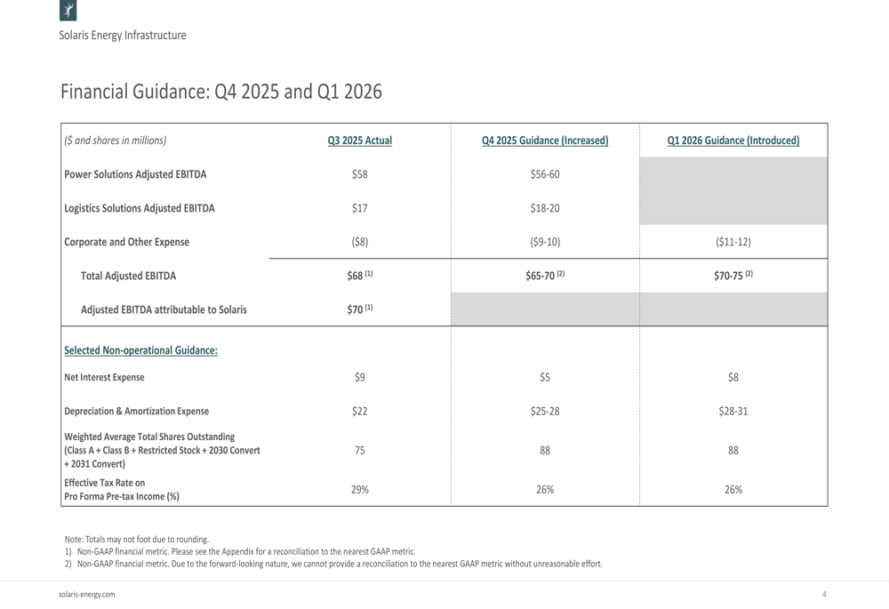 The Power Solutions segment contributed $58 million to Q3 Adjusted EBITDA, while Logistics Solutions added $17 million. Corporate expenses of $8 million partially offset these gains. The company expects further growth in Q4 with total Adjusted EBITDA projected at $65-70 million, followed by $70-75 million in Q1 2026.