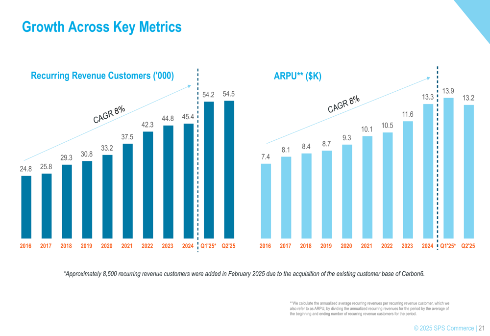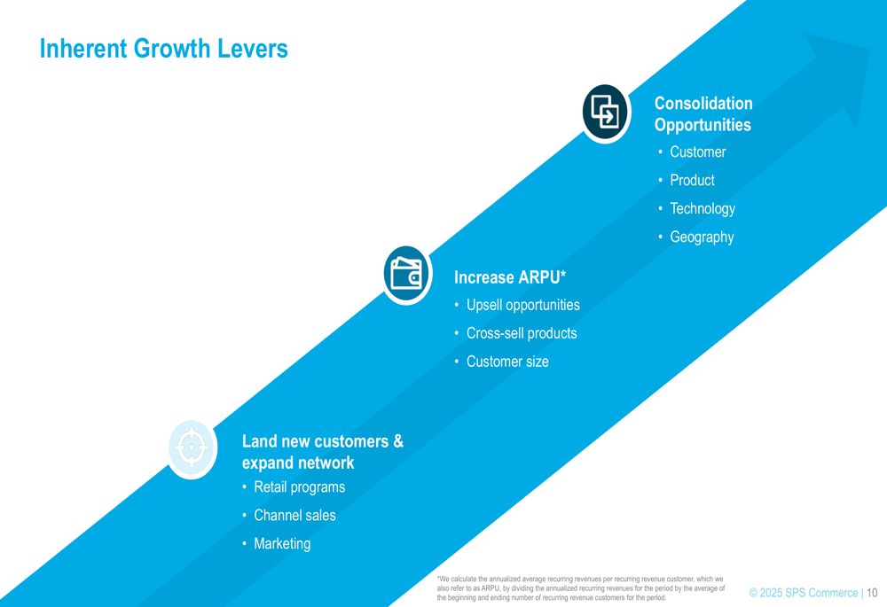 SPS Commerce outlined several growth levers in its presentation, focusing on three main strategies: acquiring new customers and expanding the network, increasing ARPU through upsell and cross-sell opportunities, and pursuing consolidation opportunities.