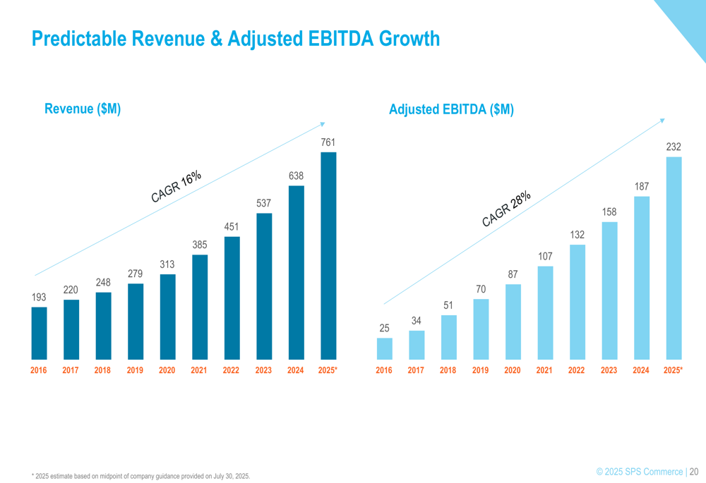 SPS Commerce has demonstrated consistent financial growth over an extended period. Revenue has grown at a 16% CAGR from 2016 to 2025, while Adjusted EBITDA has expanded at an even more impressive 28% CAGR during the same period. This reflects the company’s ability to scale efficiently and generate increasing profitability as it grows.