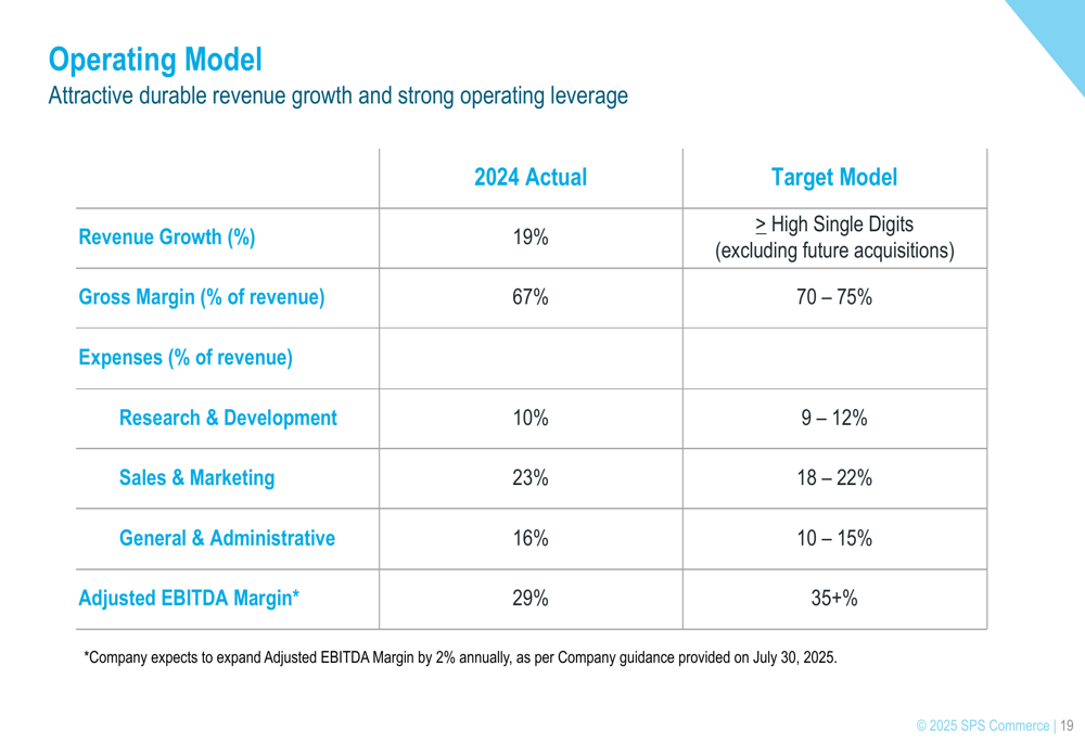 SPS Commerce’s operating model demonstrates strong fundamentals, with 2024 actual results showing 19% revenue growth, 67% gross margins, and a 29% Adjusted EBITDA margin. The company’s target model aims to maintain high-single-digit revenue growth while expanding Adjusted EBITDA margins to 35%+.