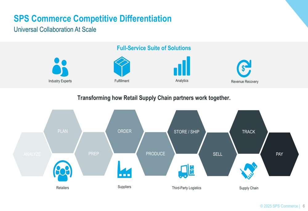 SPS Commerce has established itself as the only full-service EDI (Electronic Data Interchange) solution in the market, positioning itself as a critical infrastructure provider for retail supply chains. The company’s competitive differentiation stems from its ability to provide "Universal Collaboration At Scale" through a comprehensive suite of solutions that connect retailers, suppliers, and logistics providers.