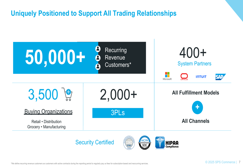 A key strength of SPS Commerce is its extensive network of connections across the retail ecosystem. The company serves over 50,000 recurring revenue customers, 3,500+ buying organizations, 2,000+ third-party logistics providers, and maintains partnerships with 400+ system partners including Microsoft, Oracle, Intuit, and SAP.