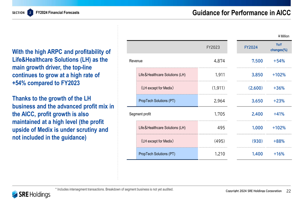 The AICC segment is expected to be the primary growth driver, with revenue projected to increase 54% and profit by 41% in FY2024. The company plans to focus particularly on expanding its Life & Healthcare Solutions business, aiming to double the number of contracts from 184 to 360 while maintaining a high ARPC of around ¥550,000 per month.