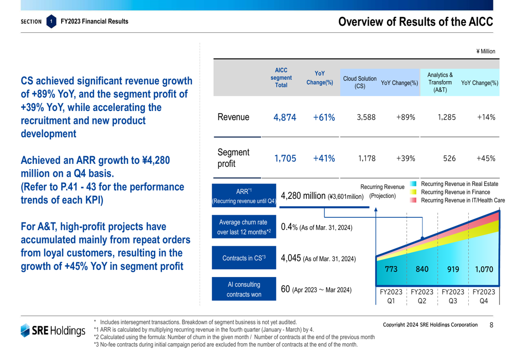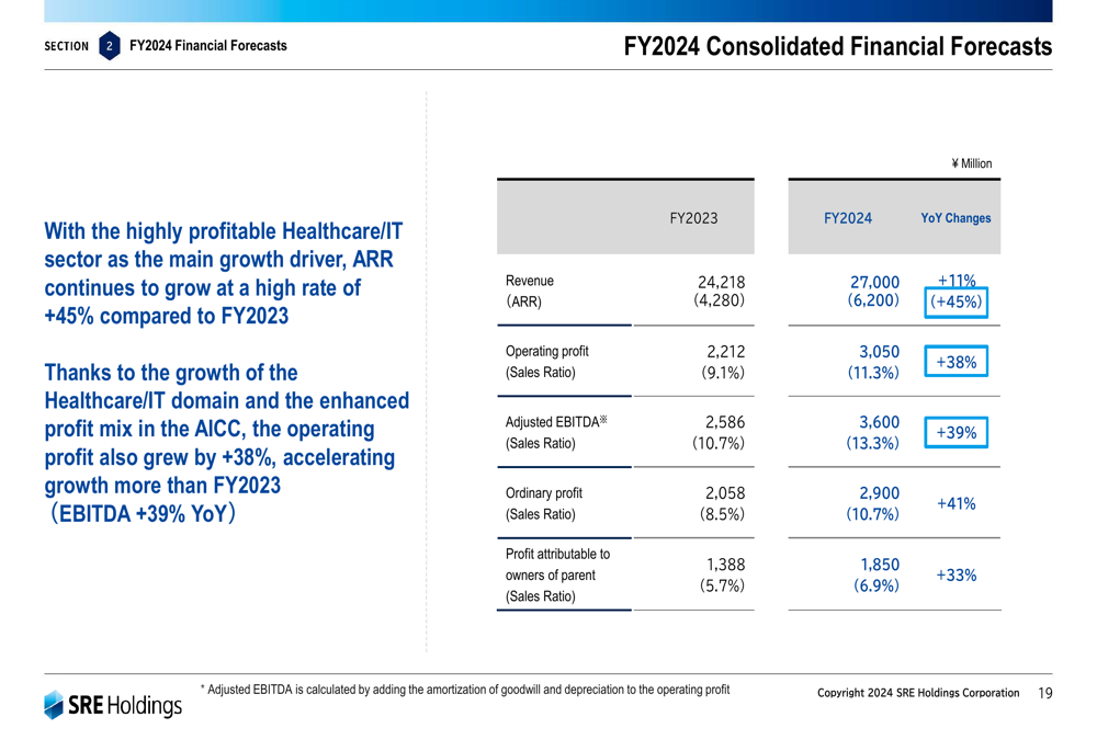 Looking ahead to FY2024, SRE Holdings forecasts continued strong growth, with revenue expected to increase 11% year-over-year to ¥27,000 million and operating profit projected to rise 38% to ¥3,050 million. The company also anticipates ARR to grow 45% to ¥6,200 million, reflecting the ongoing shift toward recurring revenue streams.