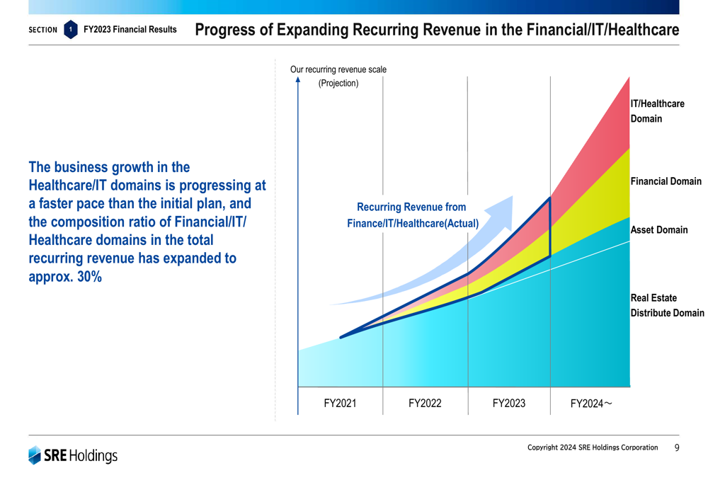 A key strategic focus for SRE Holdings is expanding its presence in the high-margin Healthcare/IT domains. The company has made significant progress in this area, with the proportion of recurring revenue from Financial/IT/Healthcare domains growing to approximately 30% of total recurring revenue. This is strategically important as these sectors have an Average Revenue Per Customer (ARPC) approximately 10 times greater than the Real Estate domain.