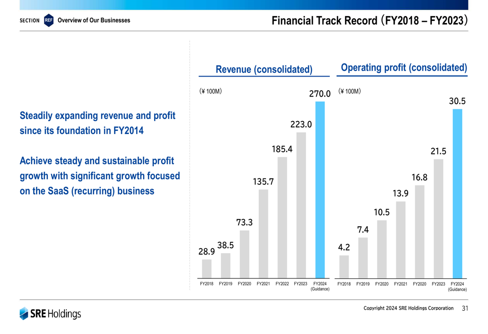 SRE Holdings delivered impressive financial results for FY2023, with both revenue and operating profit increasing by 31% year-over-year. Revenue reached ¥24,218 million, while operating profit climbed to ¥2,212 million. Notably, the company’s Annual Recurring Revenue (ARR) grew by 50% to ¥4,280 million, highlighting the success of its subscription-based business model.