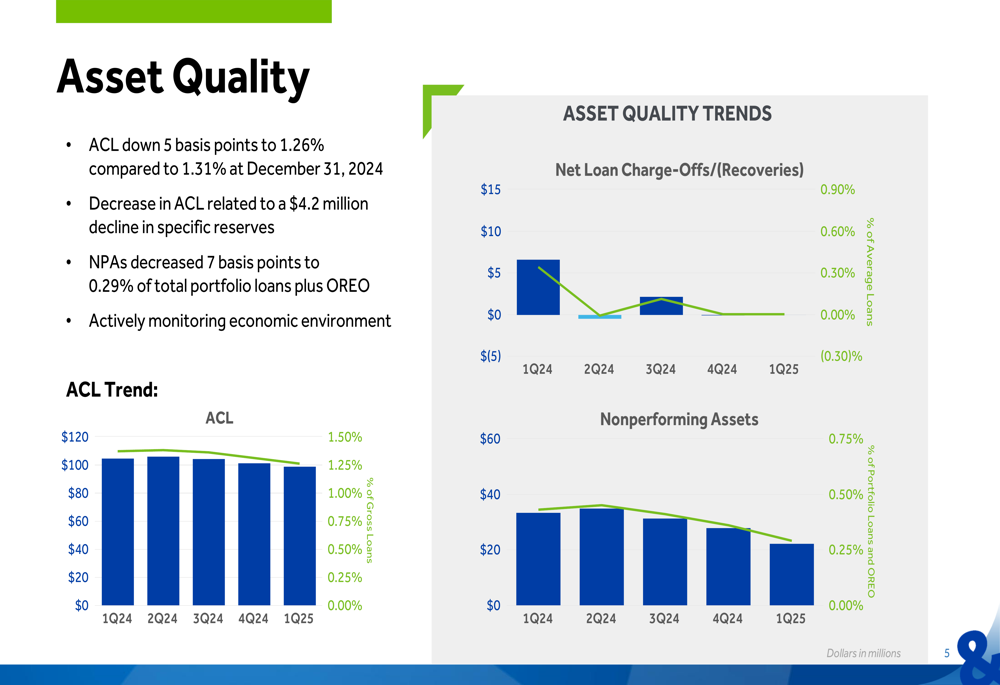 On the asset quality front, S&T Bancorp continued to show improvement. The allowance for credit losses (ACL) decreased by 5 basis points to 1.26% compared to 1.31% at the end of 2024, primarily due to a $4.2 million decline in specific reserves. Nonperforming assets (NPAs) decreased 7 basis points to 0.29% of total portfolio loans plus other real estate owned (OREO).