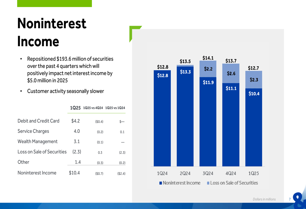 The noninterest income segment showed some seasonal weakness, with total noninterest income of $10.4 million, down $0.7 million from the previous quarter. This included a $2.3 million loss on sale of securities, which was part of the strategic repositioning effort.