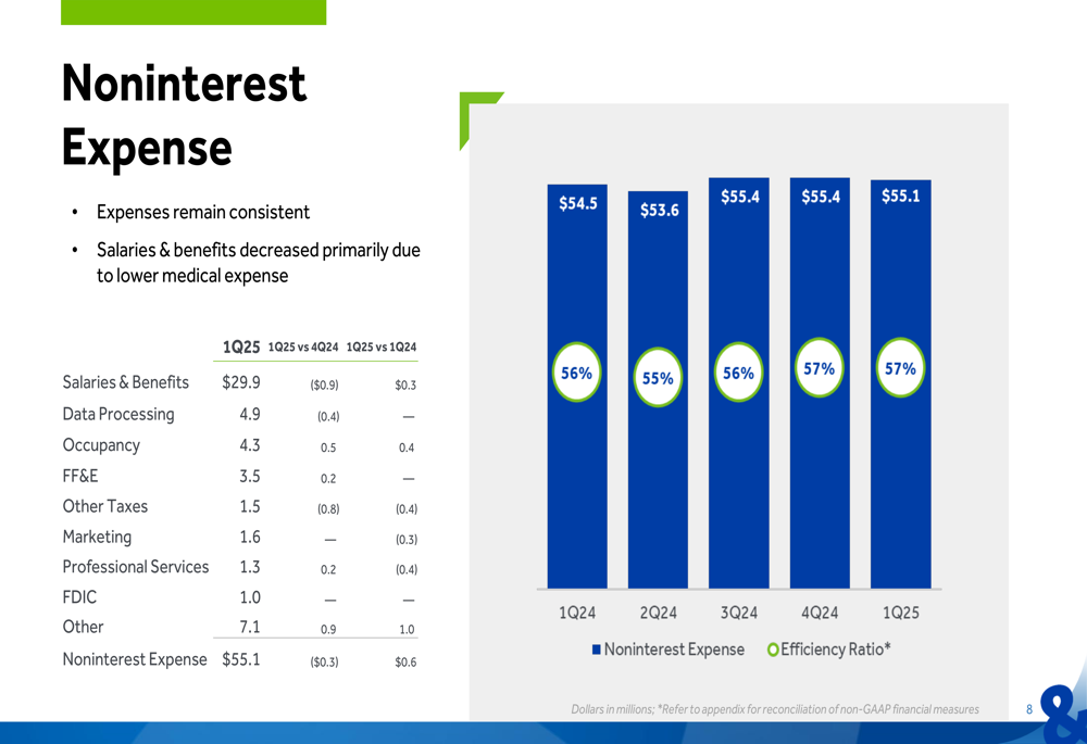 The efficiency ratio remained stable at 56.99%, indicating consistent operational discipline. This performance builds on the momentum from Q4 2024, when the company exceeded earnings expectations despite revenue challenges.