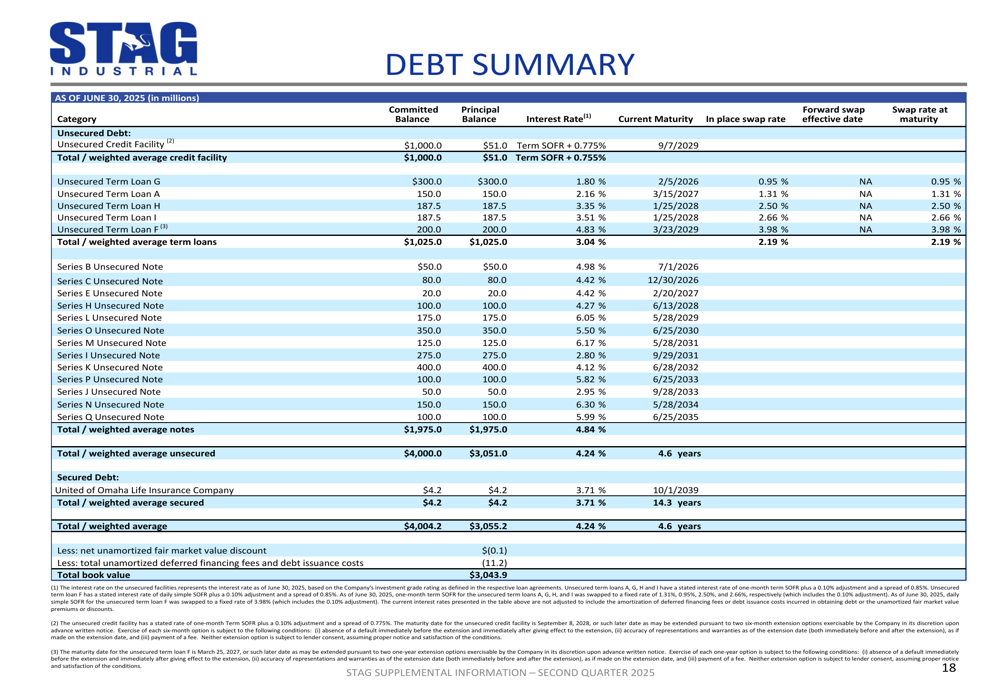 On the disposition front, STAG sold one building in Calhoun, GA during Q2 for $9.1 million. Year-to-date, the company has sold two buildings totaling 488,591 square feet for gross proceeds of $76.1 million, demonstrating its commitment to recycling capital from non-core assets.
