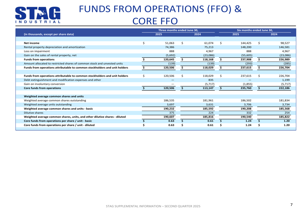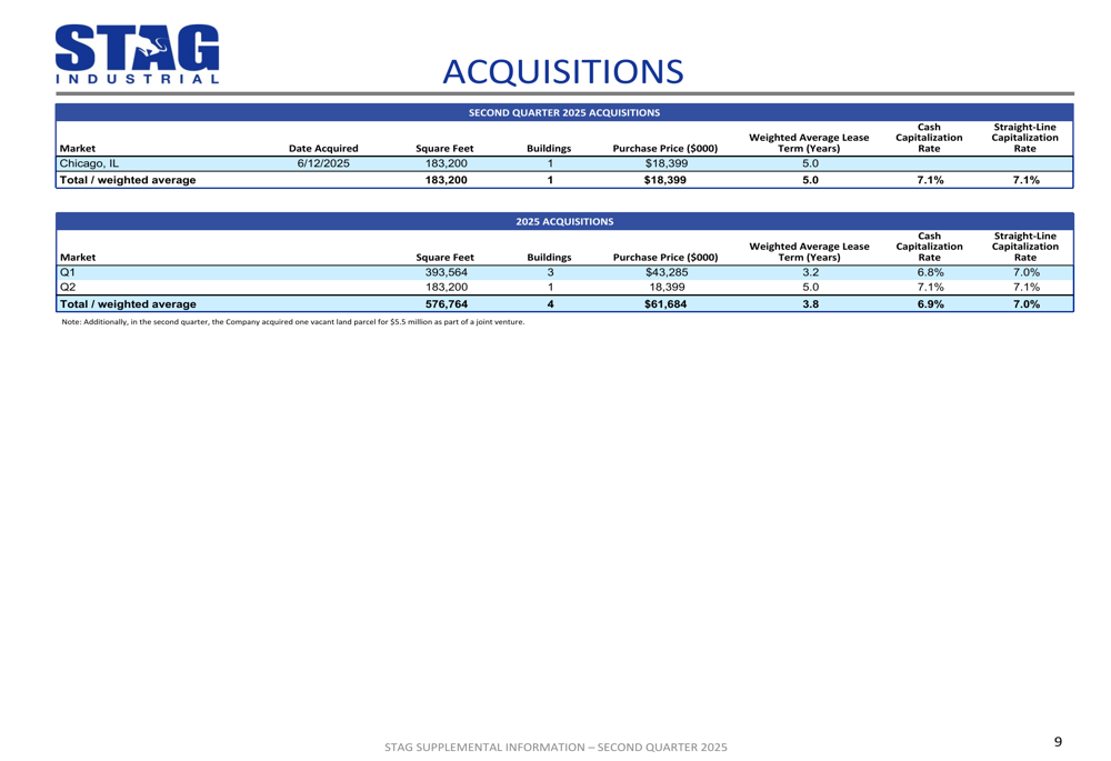 STAG continued its disciplined approach to portfolio growth in Q2 2025. The company acquired one building in Chicago, IL for $18.4 million, adding 183,200 square feet to its portfolio. This acquisition came with a 5-year weighted average lease term and a cash capitalization rate of 7.1%.