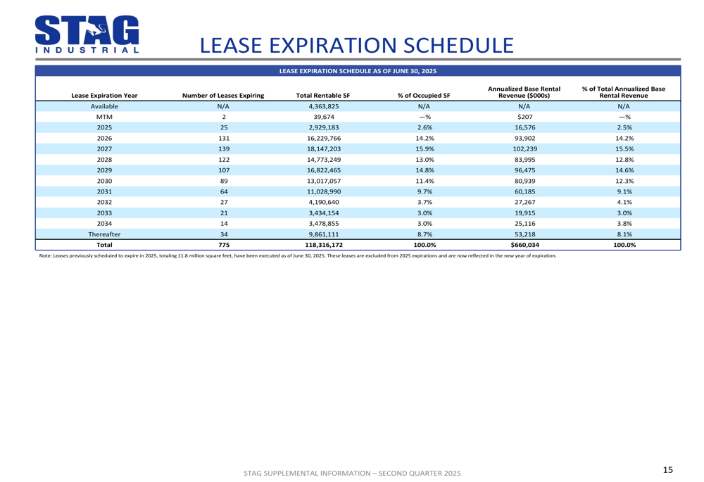 STAG’s portfolio maintained strong occupancy levels, with total portfolio occupancy at 96.3% and operating portfolio occupancy at 97.0% as of June 30, 2025. The company’s weighted average lease term stands at 4.2 years with an average rent of $5.79 per square foot.