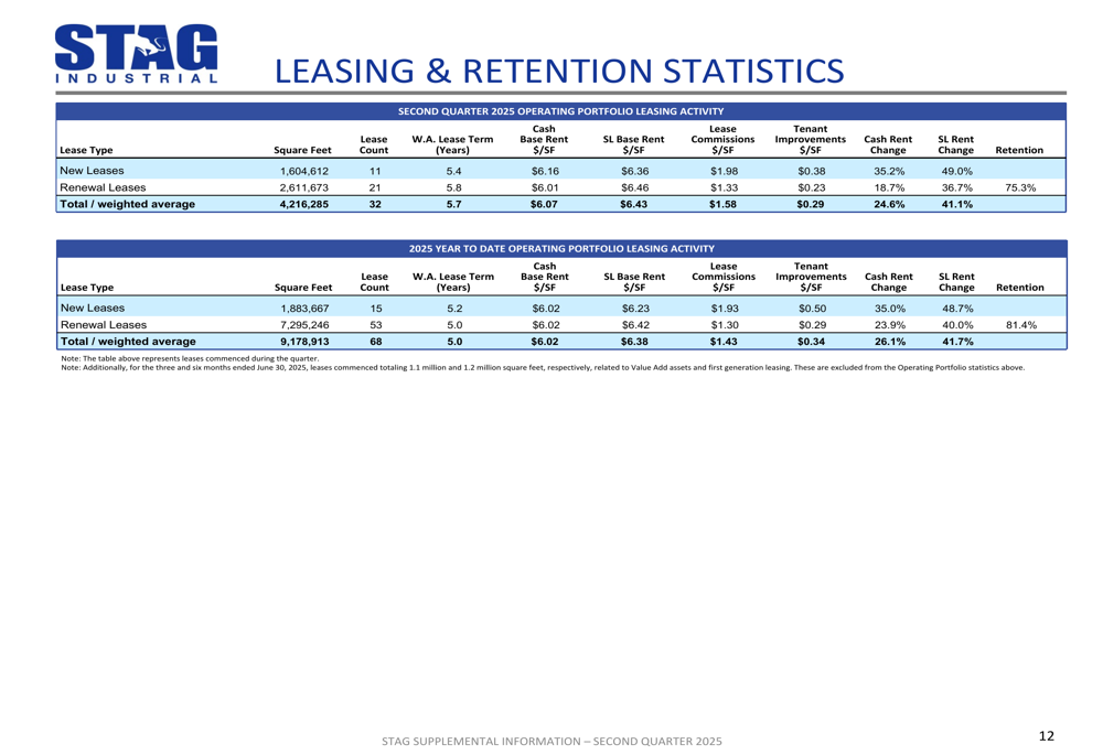 Year-to-date, STAG has executed 68 leases covering 9.2 million square feet with cash rent increases of 26.1% and straight-line rent increases of 41.7%, while maintaining an 81.4% retention rate.
