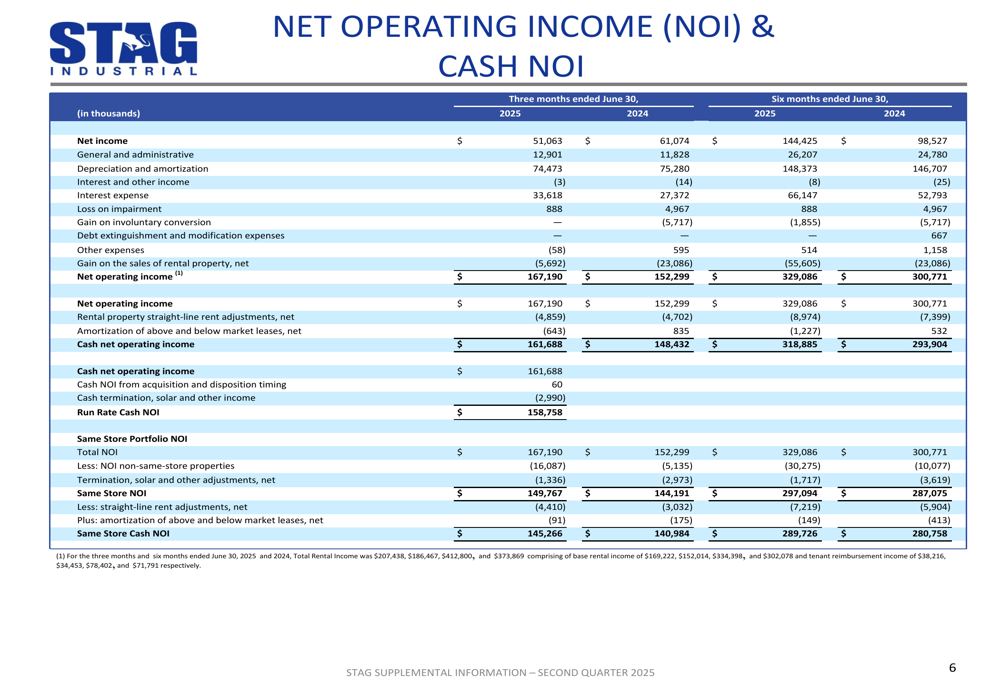 STAG reported total revenue of $207.6 million for Q2 2025, representing a 9.4% increase compared to $189.8 million in the same period last year. This growth was primarily driven by new acquisitions and strong leasing activity with significant rent increases.