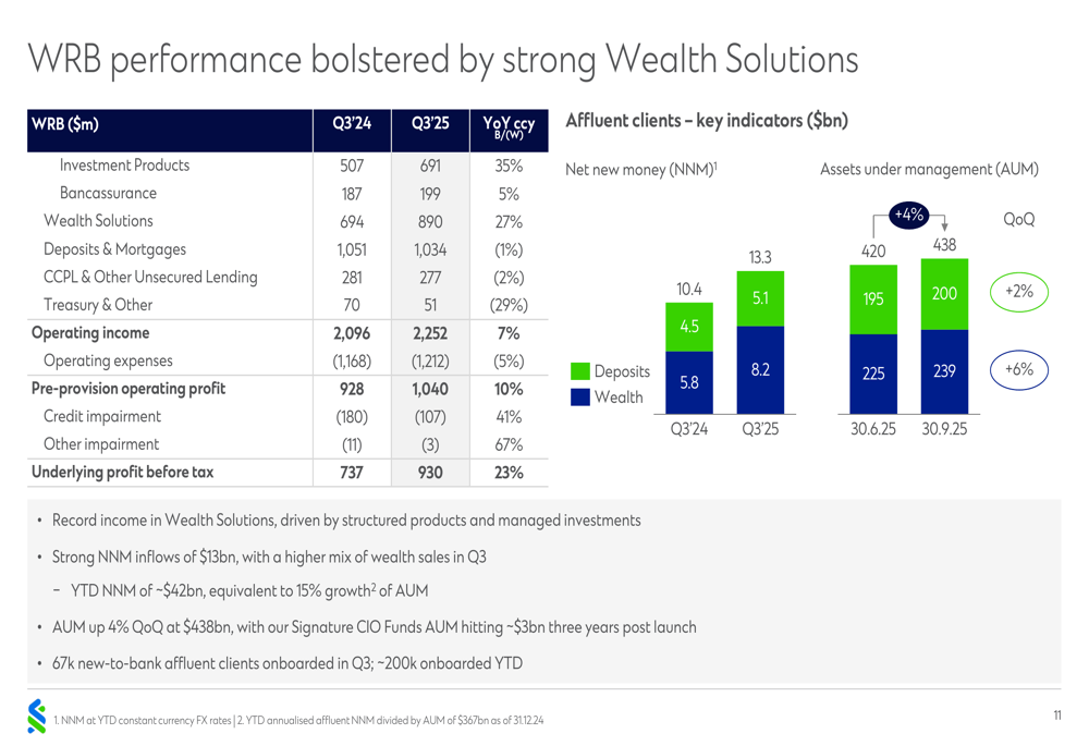 Standard Chartered continues to focus on growing its affluent client base, which is a key strategic priority. The bank attracted strong net new money inflows of $13.3 billion in Q3, with year-to-date net new money of approximately $42 billion, equivalent to 15% growth in assets under management (AUM). Total AUM for affluent clients increased from $420 billion in Q2 2025 to $438 billion in Q3 2025.
