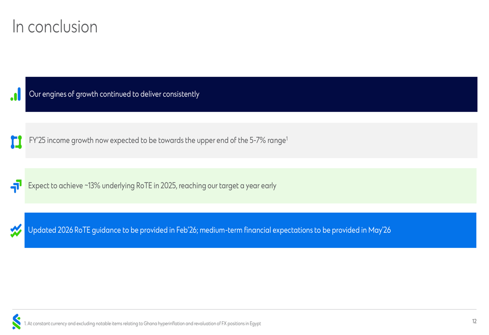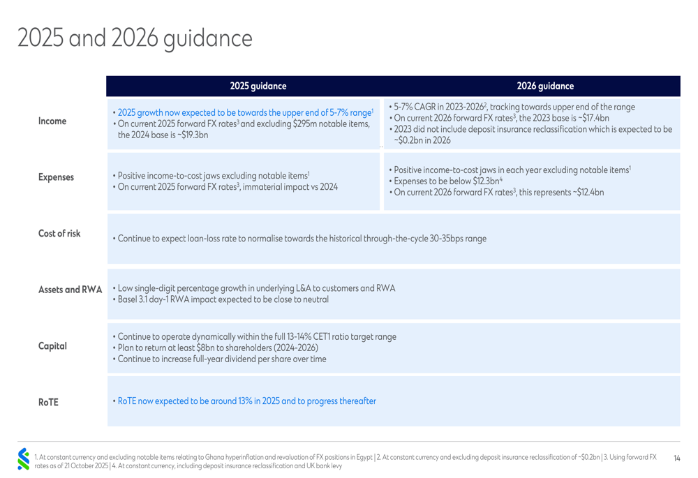 Based on the strong performance in Q3 2025, Standard Chartered has upgraded its guidance for the full year and beyond. The bank now expects 2025 income growth to be towards the upper end of the 5-7% range and anticipates achieving an underlying RoTE of around 13% in 2025, a year earlier than previously guided.