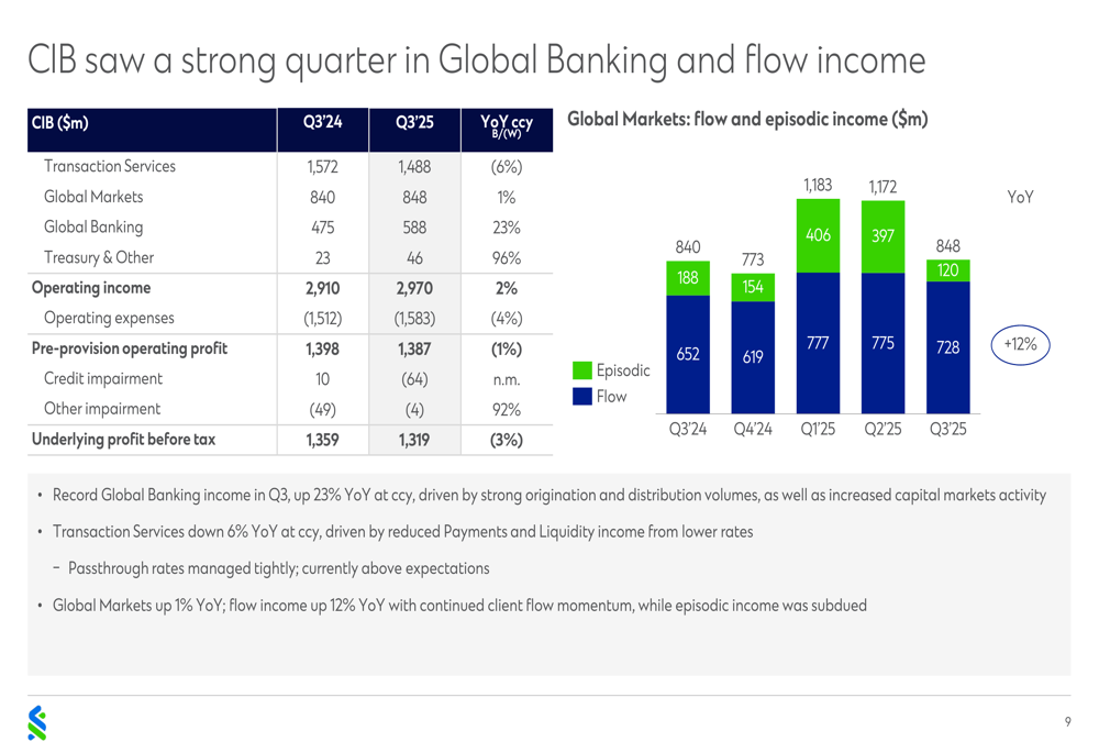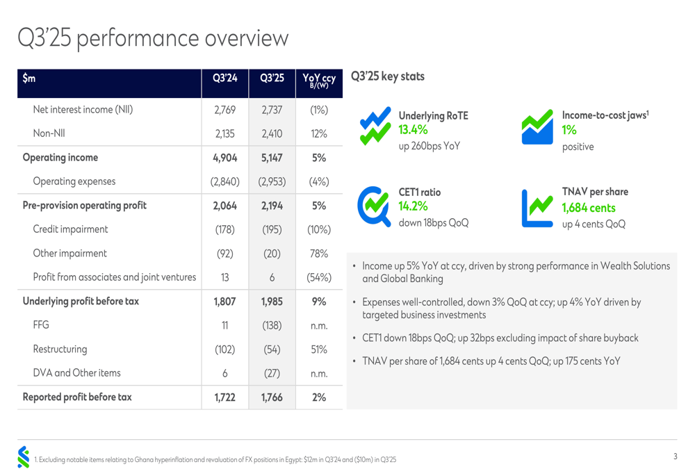 Standard Chartered reported operating income of $5.1 billion for Q3 2025, representing a 5% increase year-over-year at constant currency. This growth was primarily driven by a 12% increase in non-interest income, which helped offset a 1% decline in net interest income. The bank maintained positive income-to-cost jaws of 1%, with operating expenses increasing by 4% year-over-year to $3.0 billion.