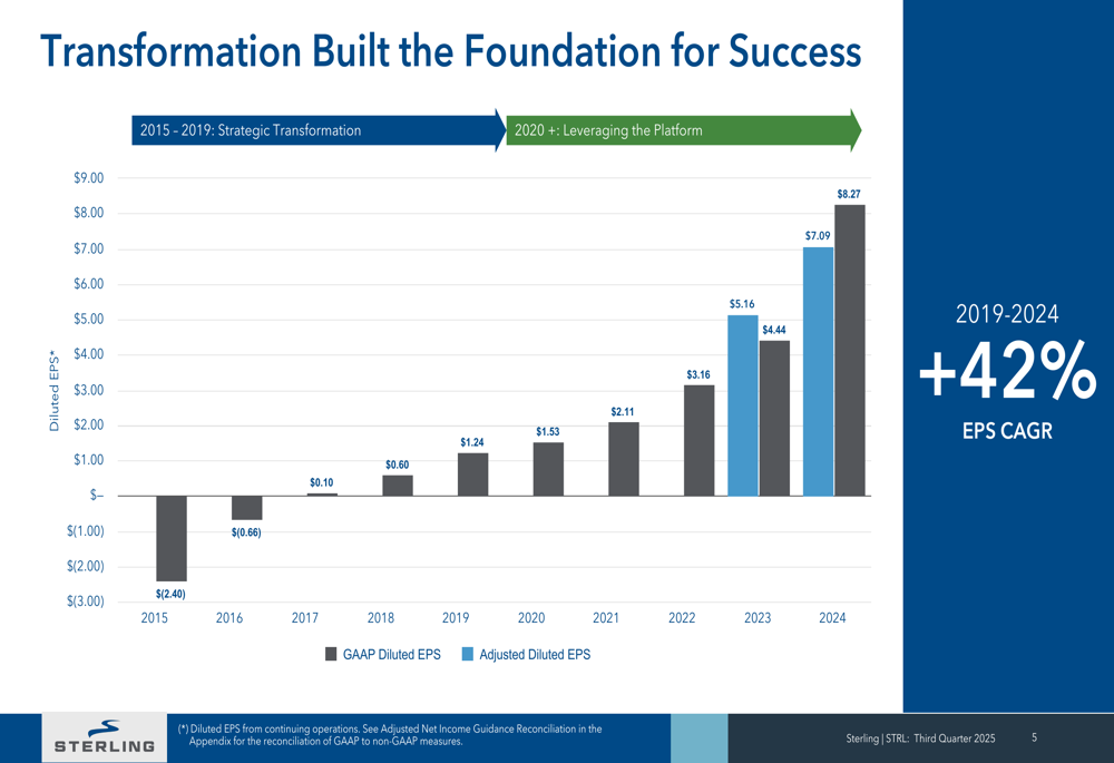Sterling has successfully positioned itself as a leading provider of infrastructure services across three key solution areas. The company’s strategic transformation, initiated in 2015, has created a strong, diversified platform with multi-year secular growth drivers.