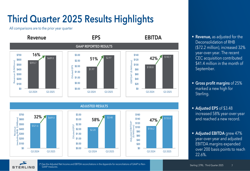 Sterling reported Q3 2025 revenue of $689.0 million, representing a 32% increase year-over-year when adjusted for the deconsolidation of RHB ($72.2 million). The CEC acquisition contributed $41.4 million to this growth. Gross profit margins reached a new high of 25%, while adjusted EPS surged 58% year-over-year to $3.48, significantly exceeding analyst expectations of $2.84.