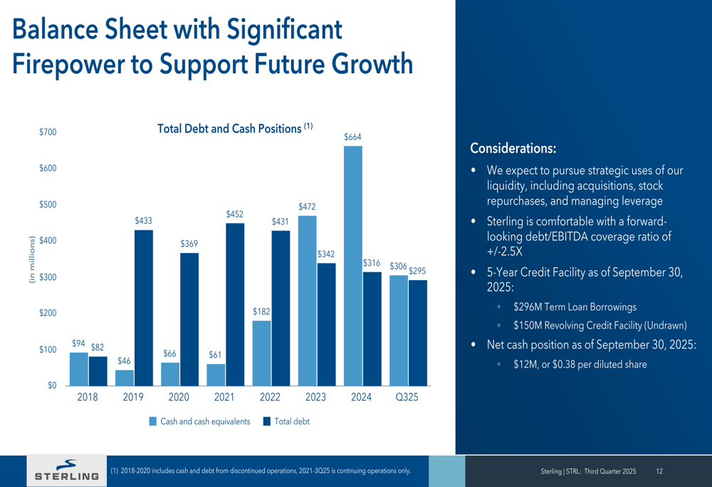 Sterling has maintained a strong balance sheet, with a net cash position of $12 million ($0.38 per diluted share) as of September 30, 2025. The company has a 5-year credit facility with $296 million in term loan borrowings and an undrawn $150 million revolving credit facility.