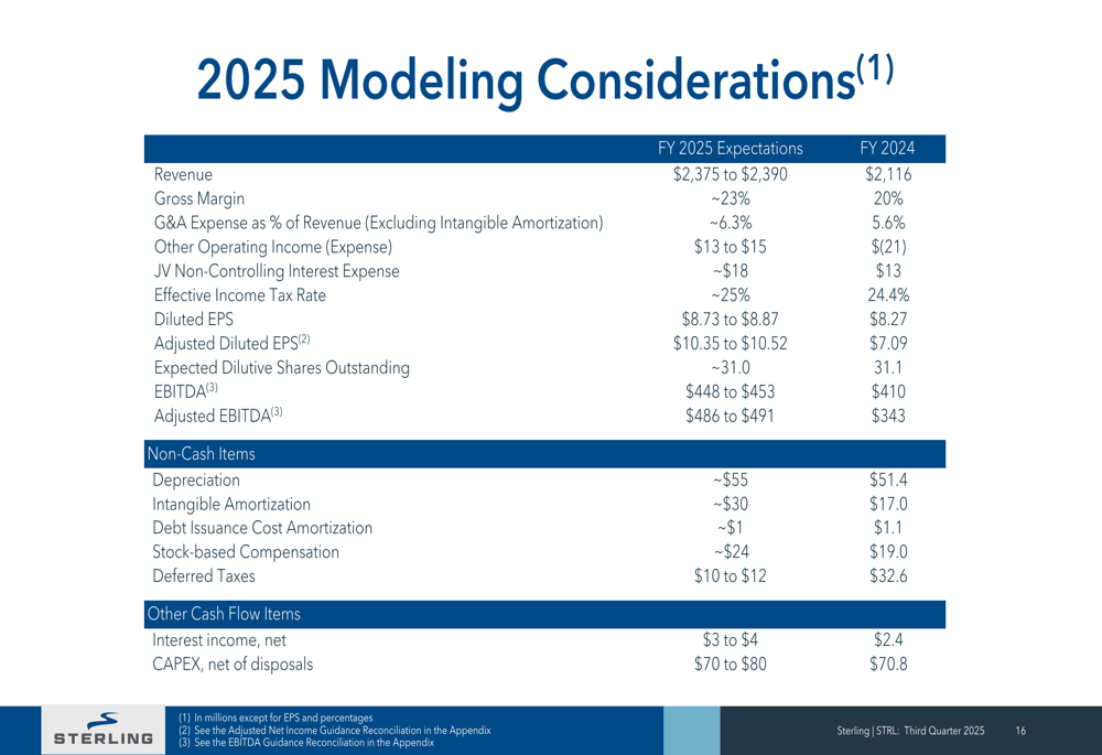 Looking ahead, Sterling provided guidance for full-year 2025, projecting revenue between $2,375 and $2,390 million, adjusted diluted EPS of $10.35 to $10.52, and adjusted EBITDA of $486 to $491 million. The company expects gross margins of approximately 23% and G&A expenses of around 6.3% of revenue.