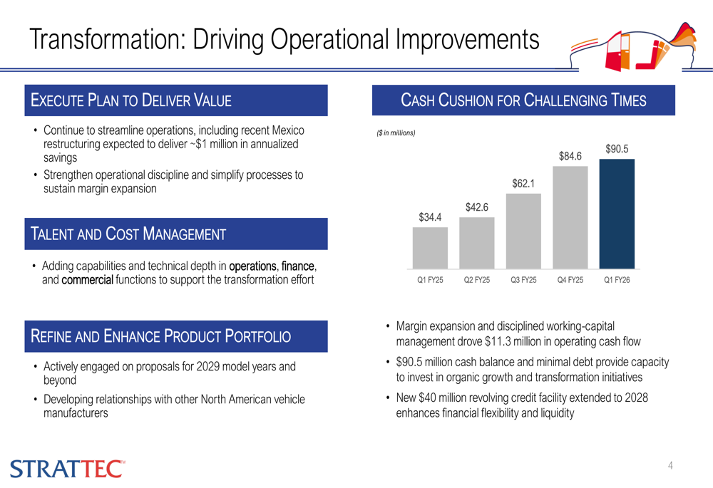 Strattec continues to execute its business transformation plan, focusing on streamlining operations, strengthening operational discipline, and enhancing its product portfolio. Key initiatives include: