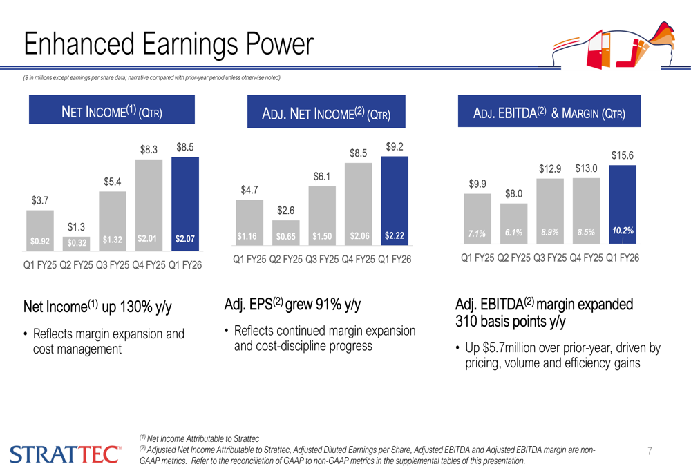 Net income reached $8.5 million in Q1 FY2026, a 130% increase from $3.7 million in the same period last year. Adjusted EBITDA rose to $15.6 million, with the margin expanding 310 basis points year-over-year to 10.2%.