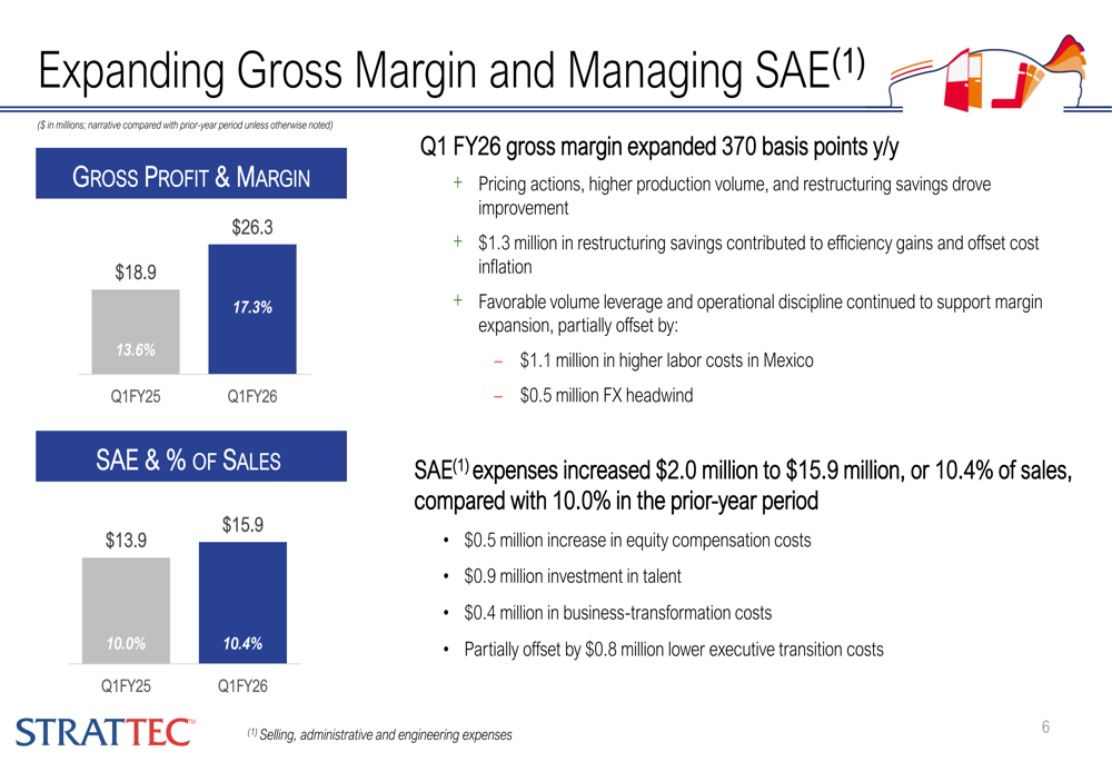 While selling, administrative, and engineering (SAE) expenses increased by $2.0 million to $15.9 million (10.4% of sales compared to 10.0% in the prior year), this was primarily due to investments in talent ($0.9 million), increased equity compensation costs ($0.5 million), and business transformation expenses ($0.4 million). These increases were partially offset by $0.8 million in lower executive transition costs.