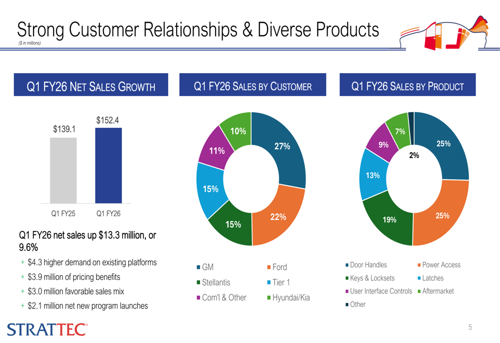 Strattec reported Q1 FY2026 revenue of $152.4 million, up 9.6% from $139.1 million in the prior-year period. This growth was driven by multiple factors, including higher demand on existing platforms, pricing benefits, favorable sales mix, and new program launches.