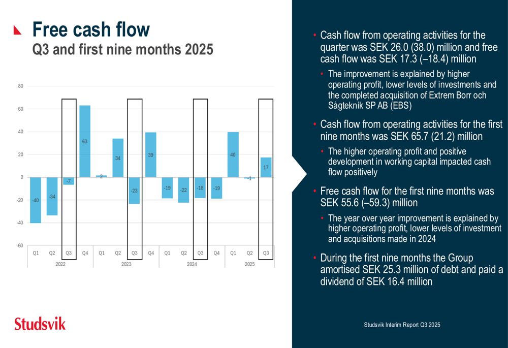 Free cash flow has also shown marked improvement, turning positive at SEK 17.3 million for Q3 2025 compared to negative SEK 18.4 million in Q3 2024. For the first nine months, free cash flow reached SEK 55.6 million, a substantial improvement from negative SEK 59.3 million in the same period last year.