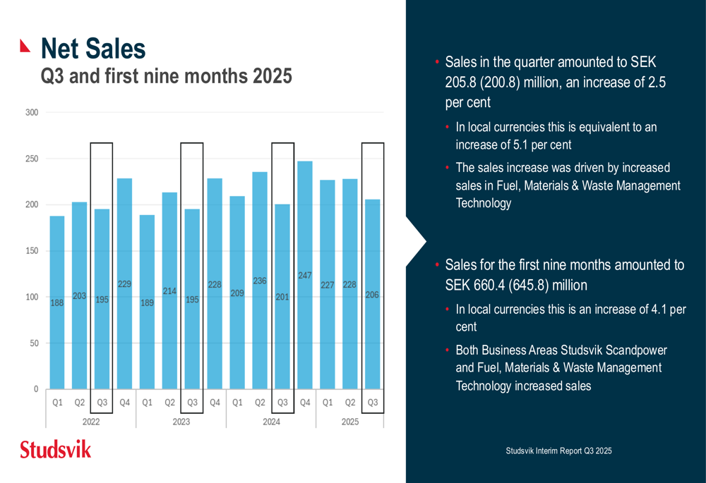 Studsvik reported sales of SEK 205.8 million for Q3 2025, representing a 2.5% increase compared to SEK 200.8 million in Q3 2024. In local currencies, this translates to a 5.1% growth. More impressively, operating profit surged to SEK 13.2 million, compared to a loss of SEK 0.5 million in the same quarter last year, resulting in an operating margin of 6.4%.
