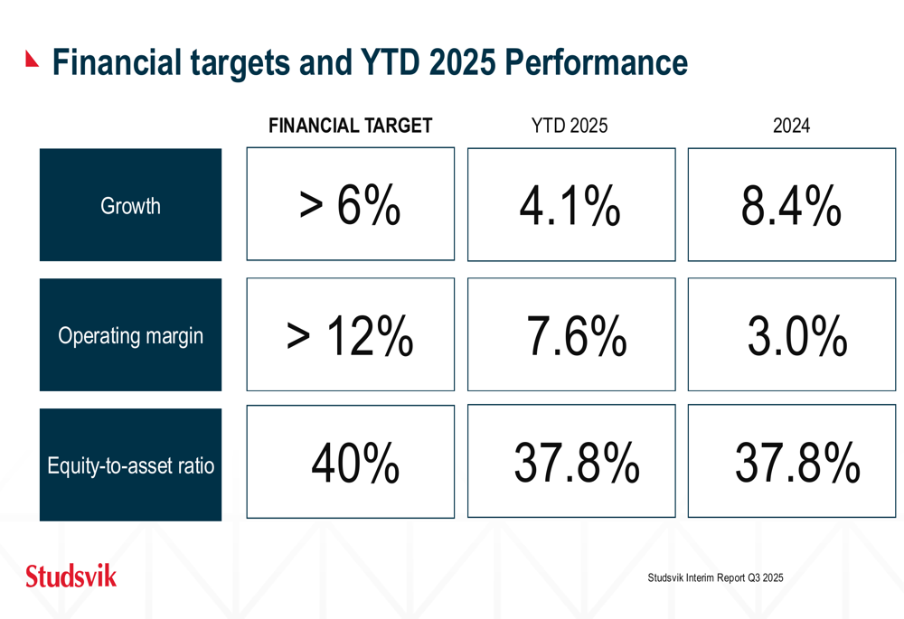Studsvik maintains its financial targets of greater than 6% growth, operating margin exceeding 12%, and an equity-to-asset ratio of 40%. While the company is currently meeting its growth target based on 2024 results, its year-to-date 2025 performance shows room for improvement in both operating margin and equity-to-asset ratio.