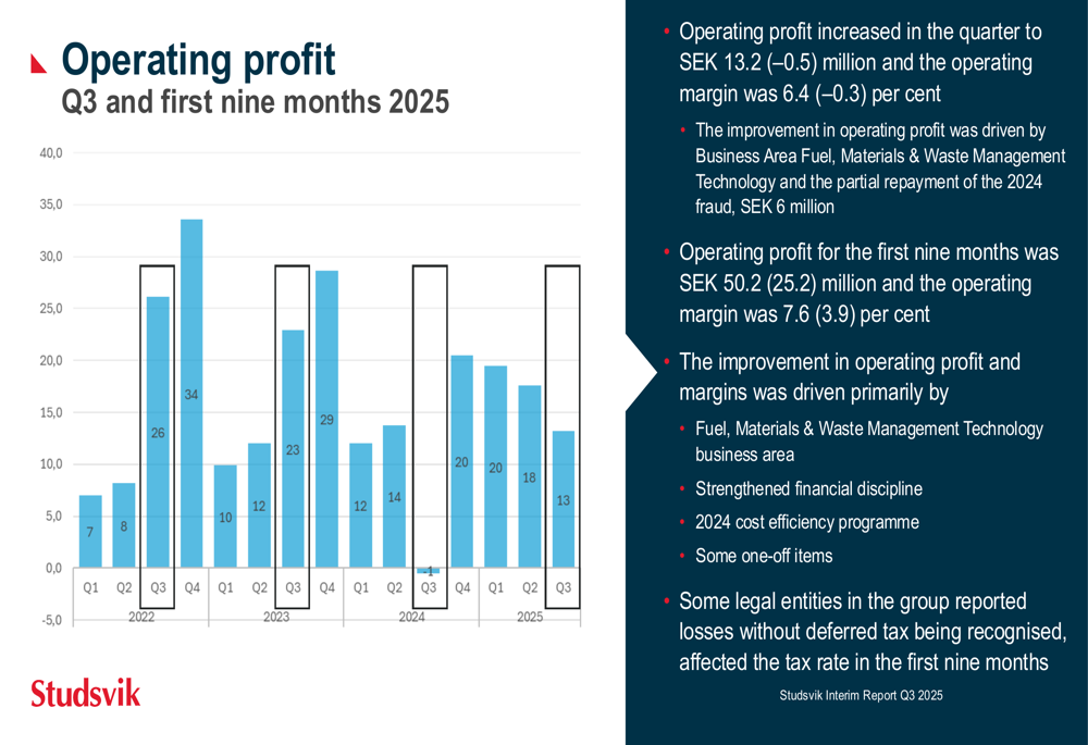 The Fuel, Materials and Waste Technology segment (38% of total revenues) demonstrated the strongest improvement, with sales increasing to SEK 79.5 million from SEK 67.7 million in Q3 2024. Operating profit surged to SEK 9.3 million from a loss of SEK 7.0 million, resulting in an operating margin of 11.7%.