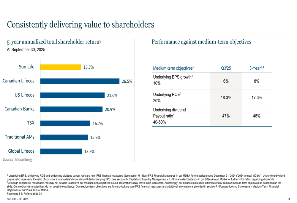 Looking ahead, Sun Life remains committed to its medium-term objectives, targeting 10% underlying EPS growth and 20% underlying ROE, though current performance (6% and 18.3% respectively) falls slightly short of these targets. The company is preparing for a $2 billion transaction in early 2026 and continues to focus on strategic acquisitions that align with its growth priorities.