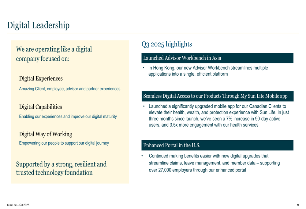 The company highlighted its digital transformation efforts, including the launch of the Advisor Workbench in Asia and enhancements to the My Sun Life Mobile app: