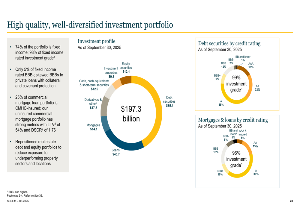 Sun Life's investment portfolio remains high-quality and well-diversified, with 74% in fixed income assets, of which 98% are rated investment grade. This conservative approach positions the company well for potential market volatility: