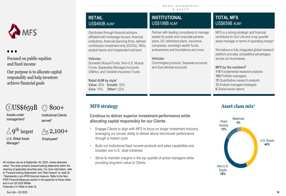 The Asset Management segment, which includes MFS and SLC Management, continues to be a significant contributor to Sun Life's earnings. MFS, with $659 billion in assets under management, serves over 800 institutional clients globally: