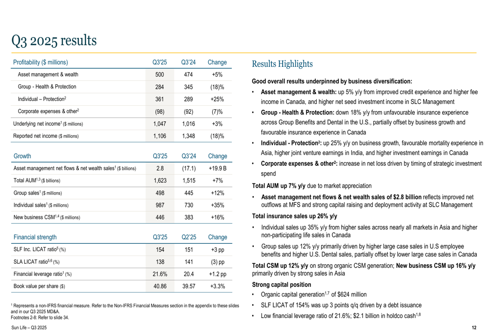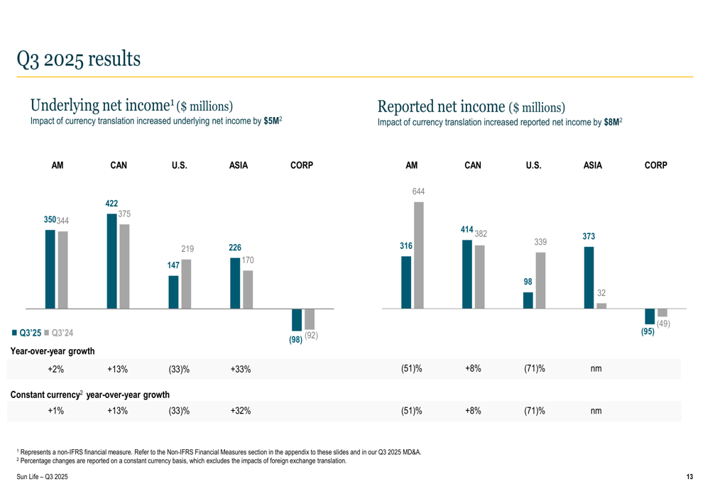 Sun Life's Q3 2025 results demonstrated the company's resilience amid varying performance across business segments. Underlying net income reached $1.047 billion, up 3% from the previous year, while reported net income declined 18% to $1.106 billion.